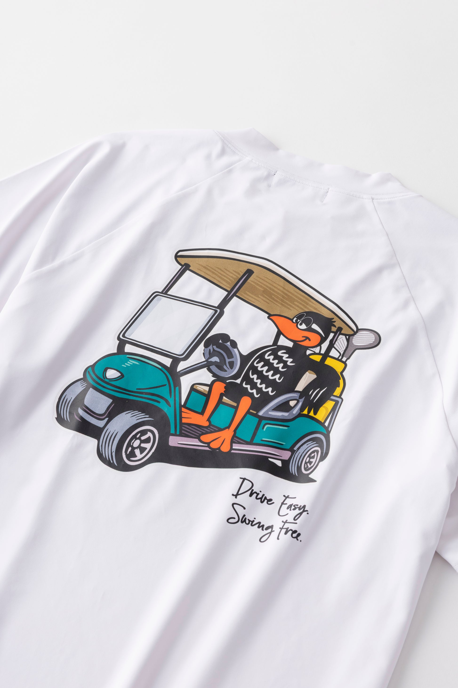 OKINAWA GOLF CLUBのキャラクターの、沖縄固有の飛べない鳥「ヤンバルクイナのHiga-kun」が、カートに乗ってのんびりと移動する姿を大きなバックプリントでデザインしました。