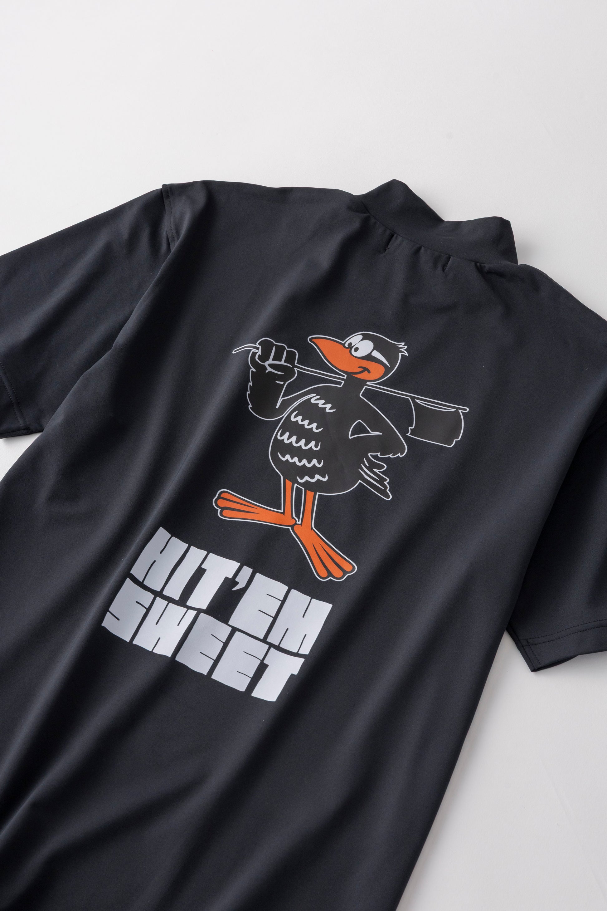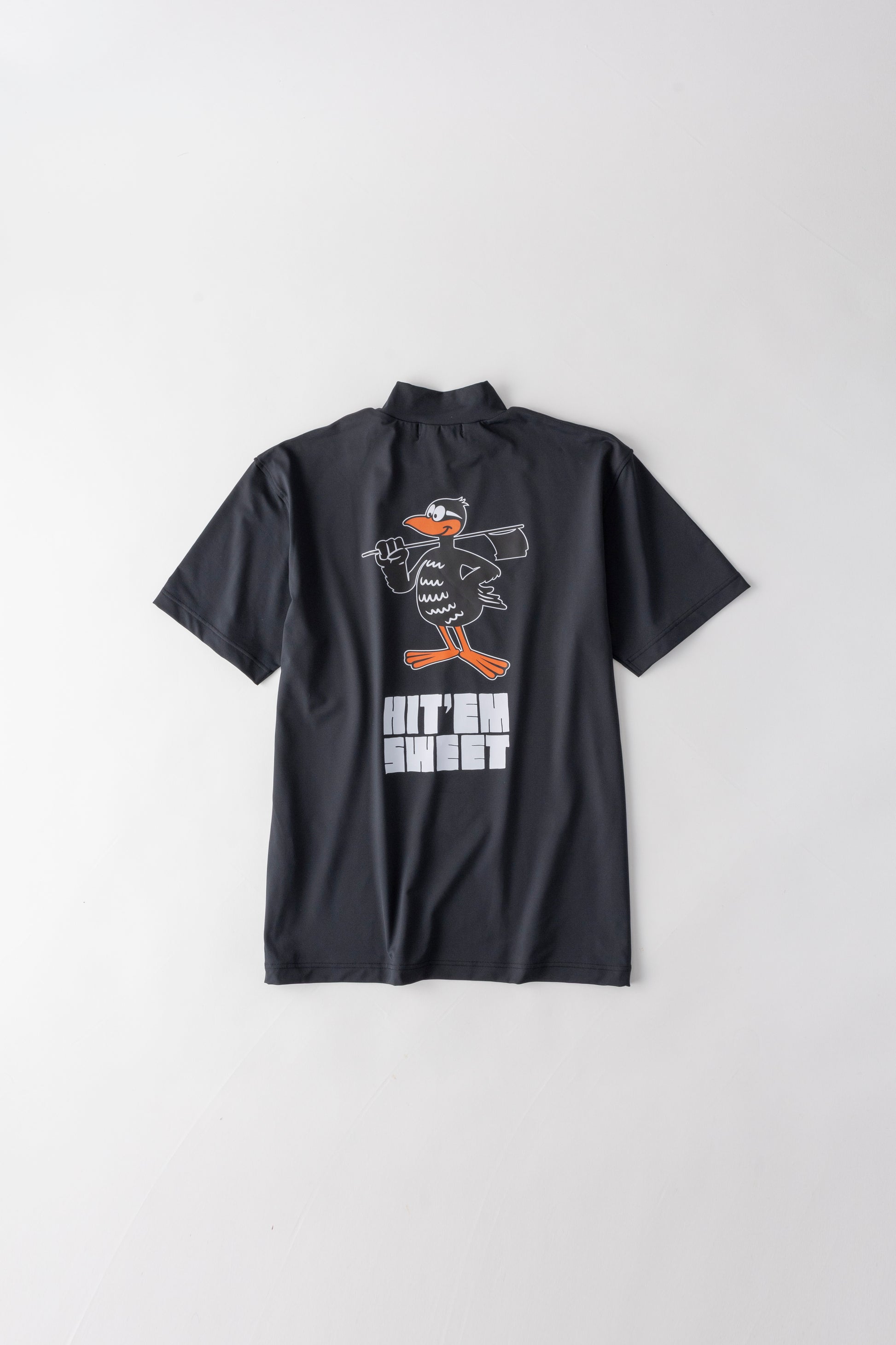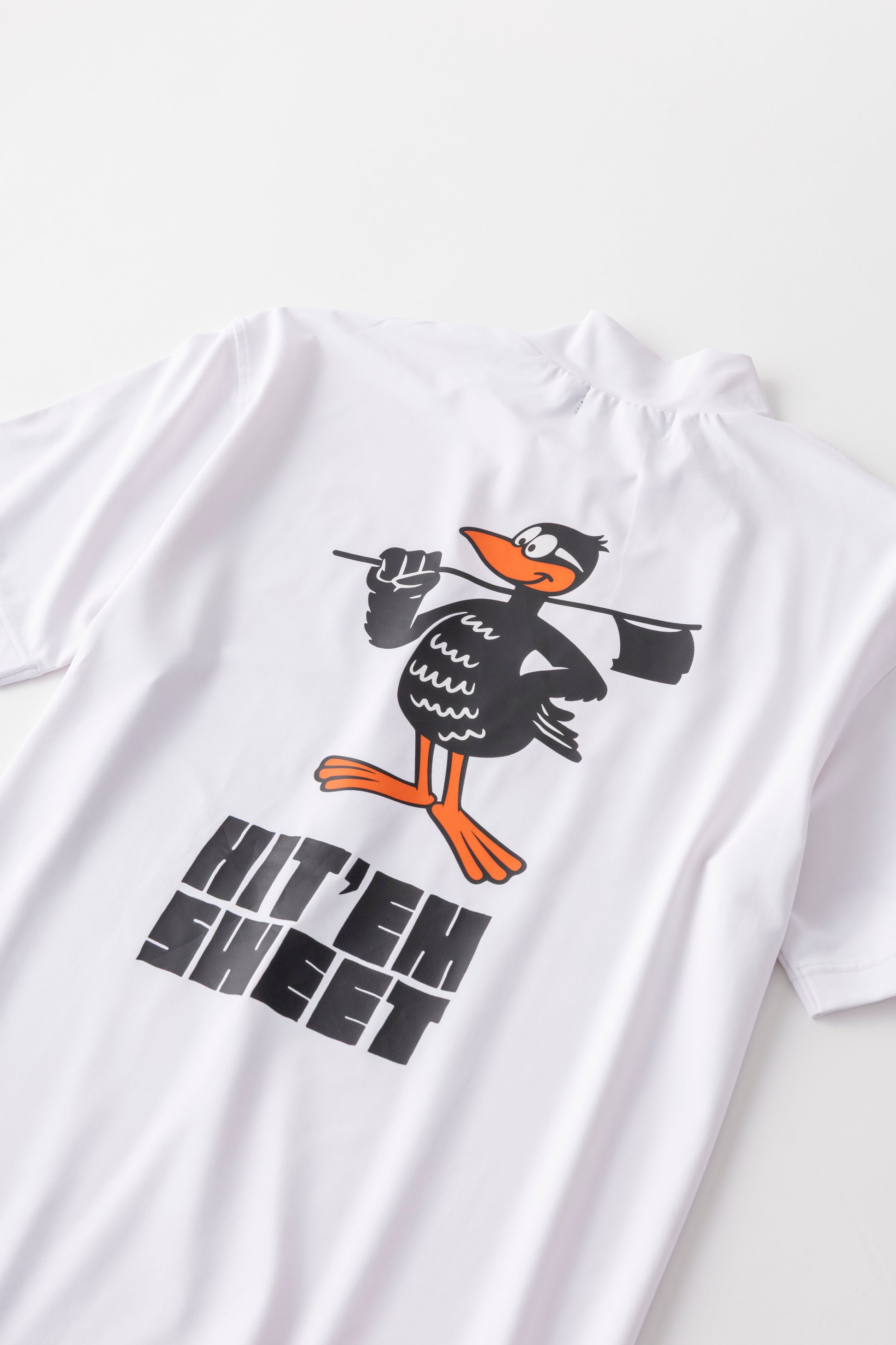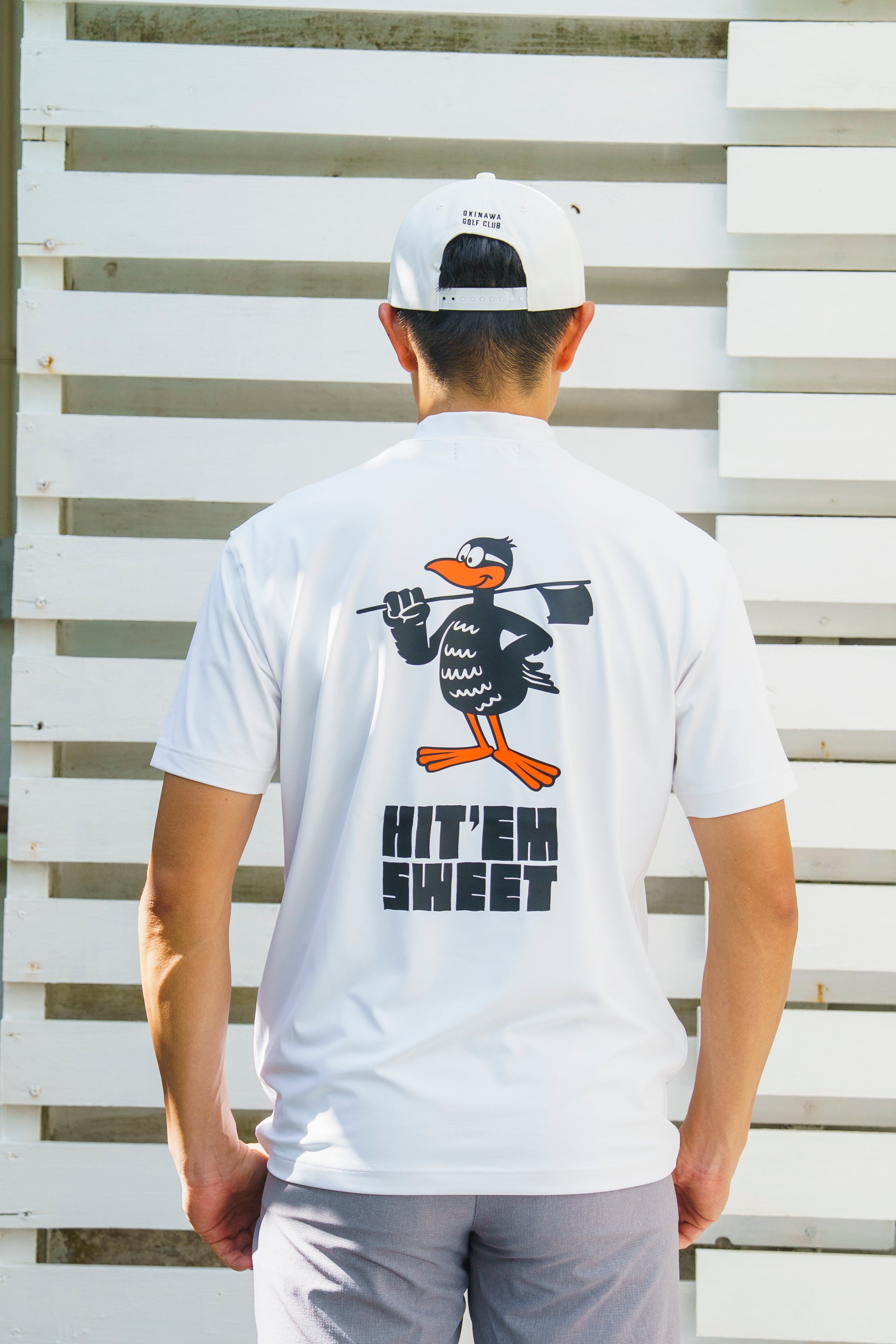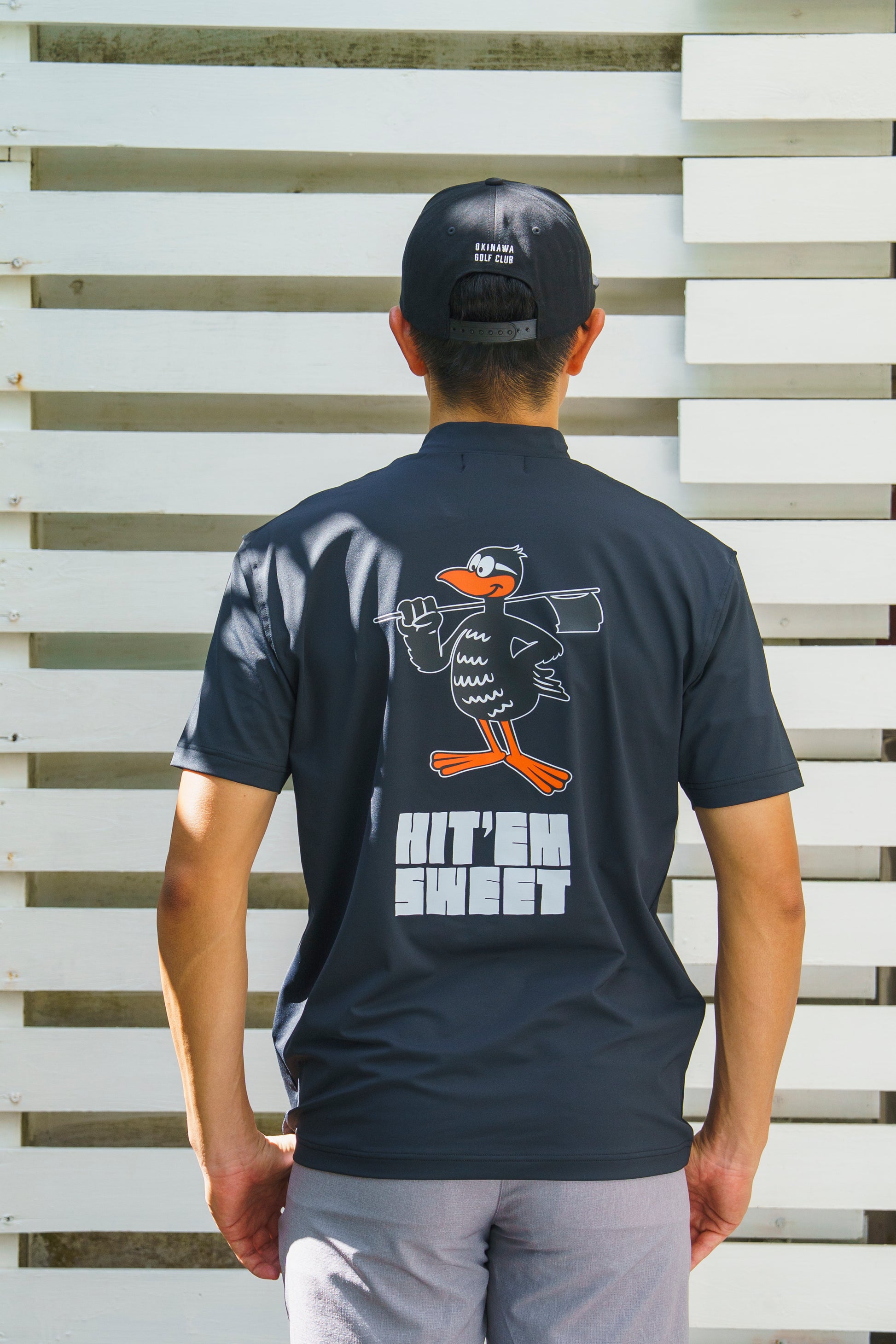 沖縄ゴルフクラブのキャラクターの、沖縄固有の飛べない鳥「ヤンバルクイナのHiga-kun」を大きくバックプリントでデザインしました。